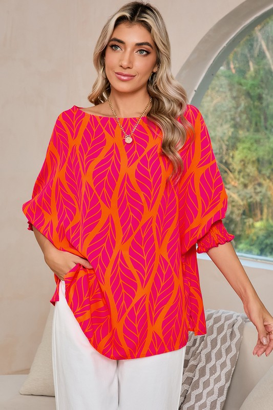Tropical Leaf Print Smocked Cuffs Loose Blouse