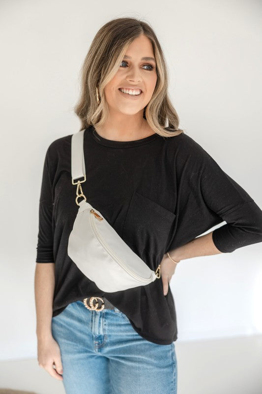 Tis belt bag has an interior pocket to keep your things organized. Includes and adjustable hip to crossbody strap.