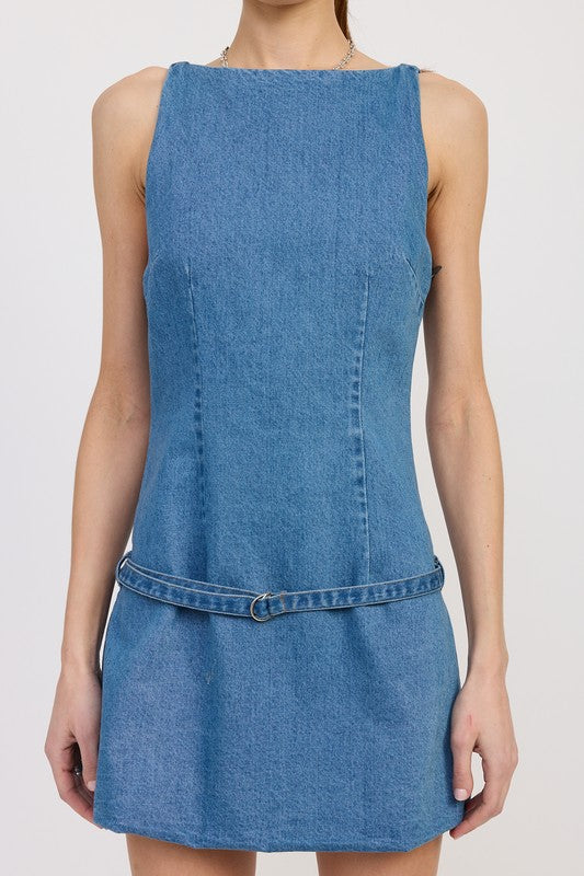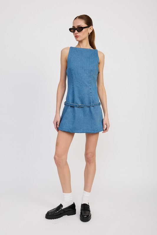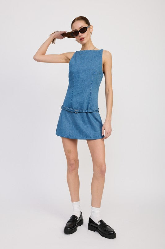 DENIM MINI DRESS WITH LOW WAIST BELT