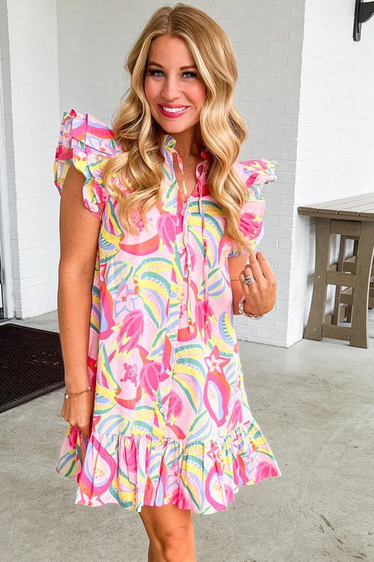 Floral Ruffle Trim Flutter Sleeve Buttoned Dress
