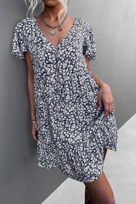 Women's Floral Short Sleeve V Neck Midi Length Dress