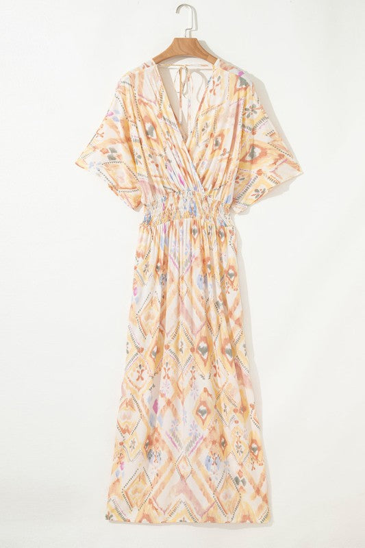 Geometric 3/4 Sleeve Shirred Maxi Dress