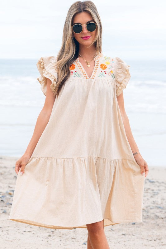 This linen dress is totally off-the-chain and totally down-to-earth for trendy chicks. It has pretty flower embroidery that's super classy and catches the eye. The flounced sleeves with pom pom flair give off major girly vibes. This v neck dress with a little pleating is so chic and elegant.