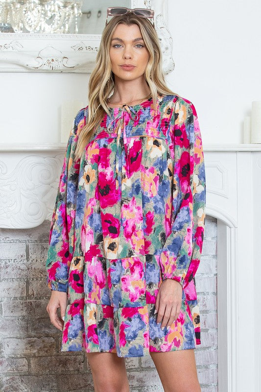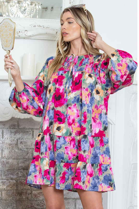 Multicolour Floral Tie Neck Bubble Sleeve Shift Dress