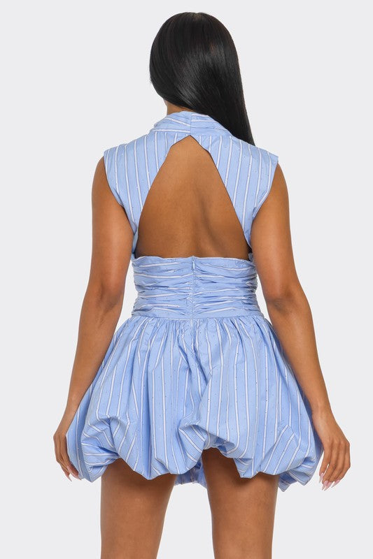 This dress is a playful and feminine mini dress in a dreamy periwinkle blue with a subtle vertical stripe pattern that gives it a modern, polished edge. The fabric has a soft sheen and delicate metallic threading that catches the light just enough to add a hint of glam without overpowering the look.