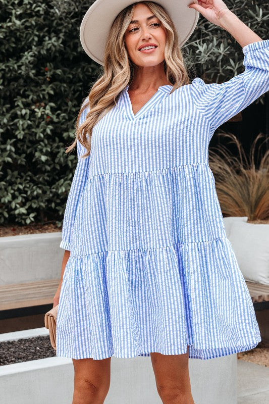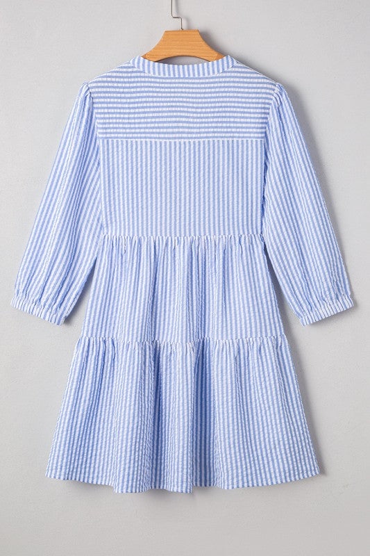 Stripe 3/4 Sleeve Pocketed Tiered Dress
