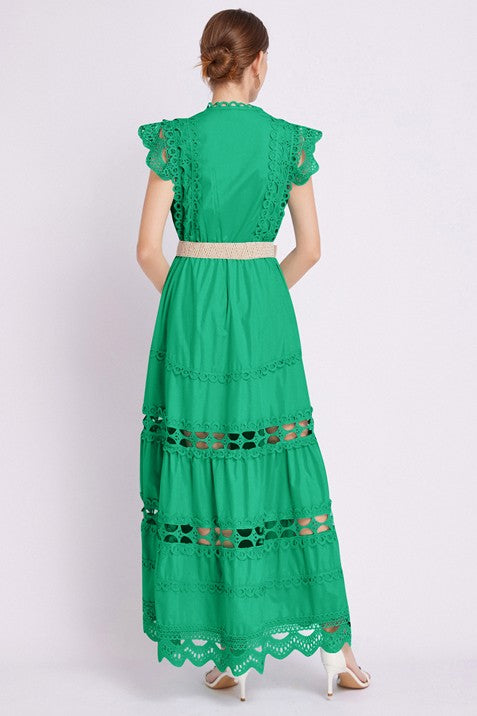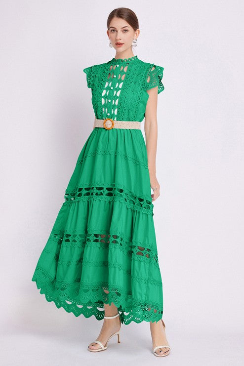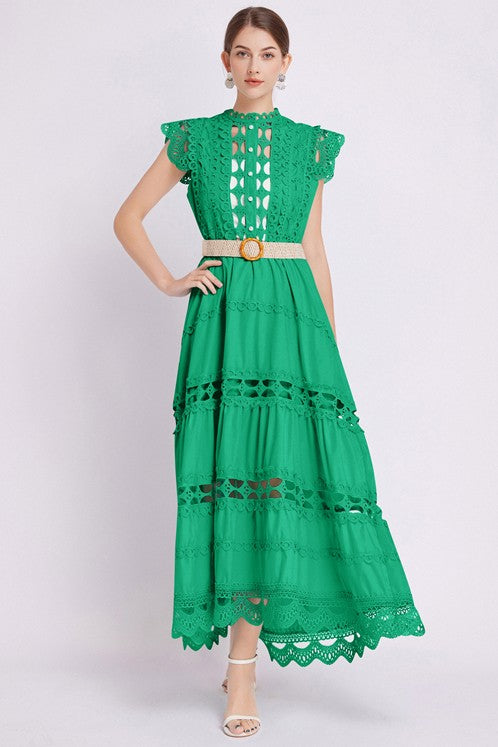 Details-Embroidered Ruffle long maxi dress, round neckline, sleeveless, elasticized trim waist with belt
