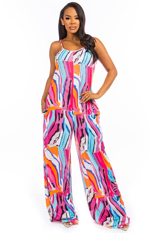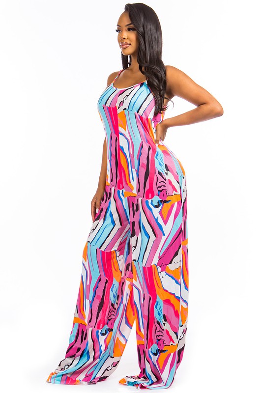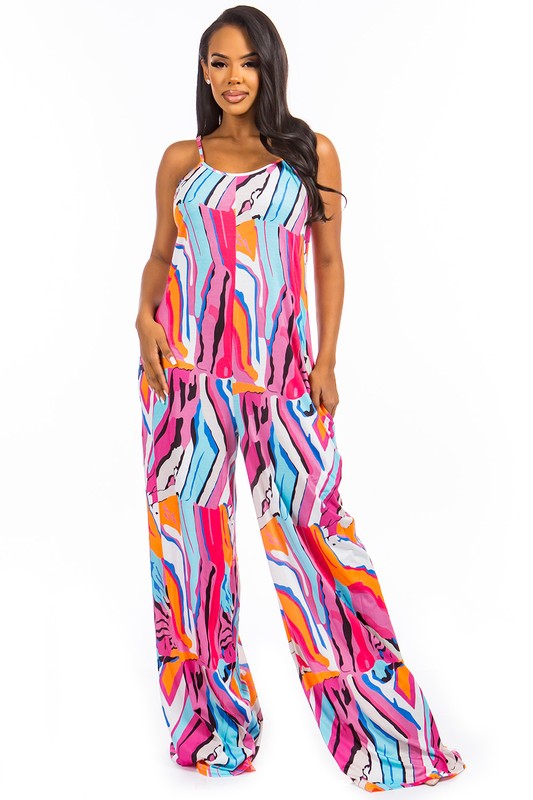 Sexy jumpsuit, round neckline, multi print, sleeveless, side zipper ,palazzo pants side pocket.