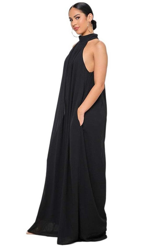 Sexy summer jumpsuit, sleeveless round neckline with back button , chiffon style side pocket, wide leg style pants