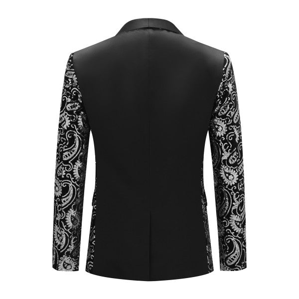 This dress jacket features single-breasted, notched lapel, center vent, one button closure, hot stamping printing process.