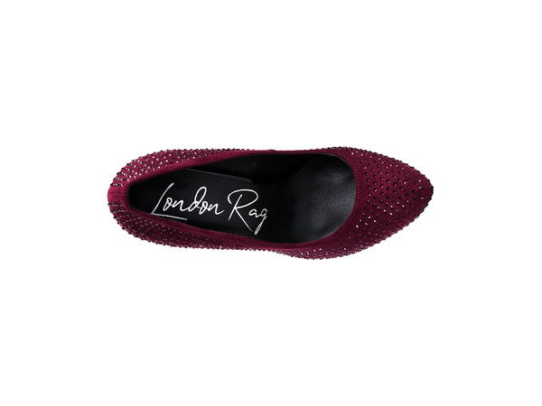 High Heeled Dress Sandal with diamante heat set in microfiber. The stiletto pumps with the raised platform are a stylish pick. The heat set diamante detail looks gorgeous on feet.