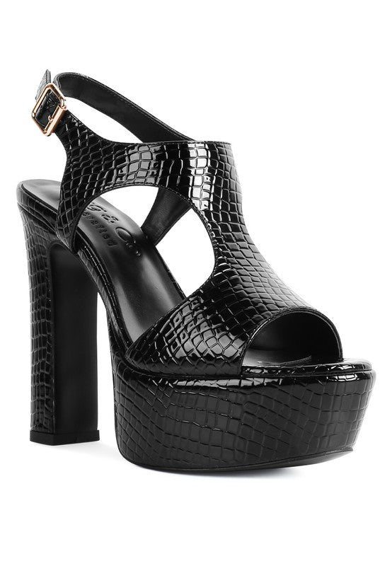 Style blazing cut out sandals are must for your closet: ultra high heeled block sandals in croc textured faux leather. The superb construction and finish is for keeps! The dainty construction in enhanced with shiny metallic hardware.