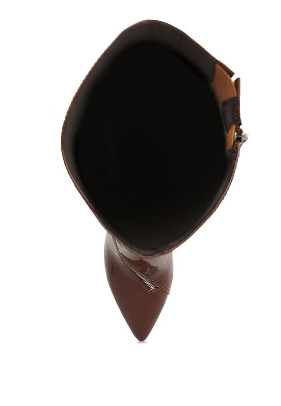 The calf boot with zipper detail around the shaft, this high heel winter boot is statement wear. Comes with an inner side zipper which makes it easy to wear.