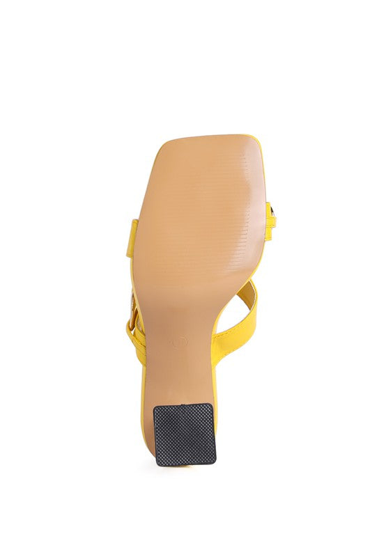 Square toe mid heel stylish slides with metal buckle details on the strap and clear twist heel. Comfortable height and complements all summer looks.