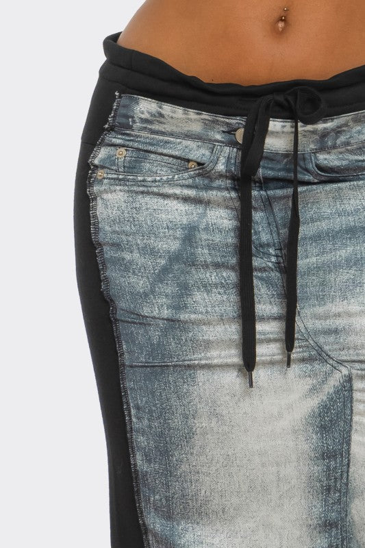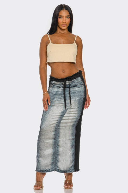 Step into street-style territory with the \"Fade Game\" skirt - a bold remix of denim and athleisure. This maxi-length skirt features a distressed washed-denim front panel paired with black contrast knit sides and back, giving the illusion of a jogger-meets-denim fusion.