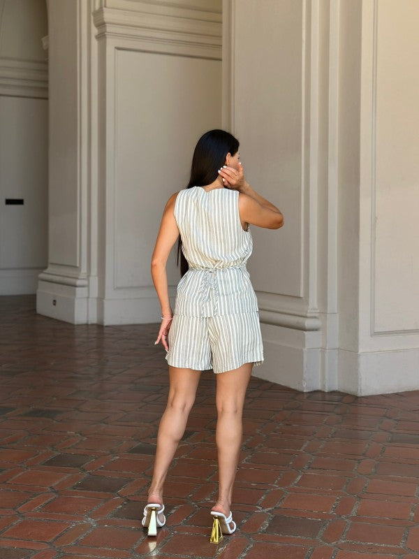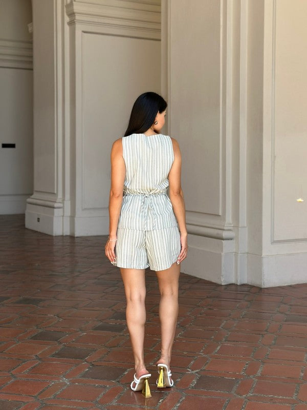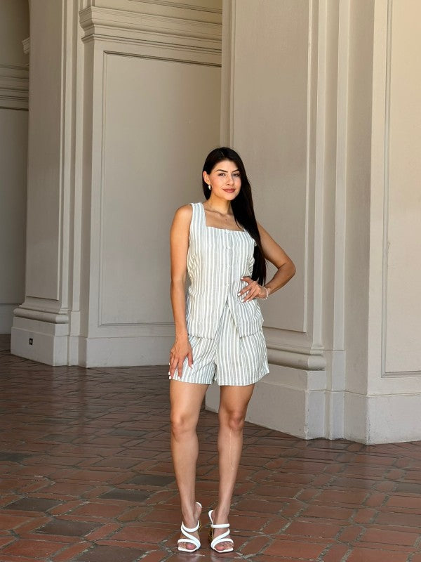 Linen Stripe Pocketed Shorts and Button-Down Vest Set