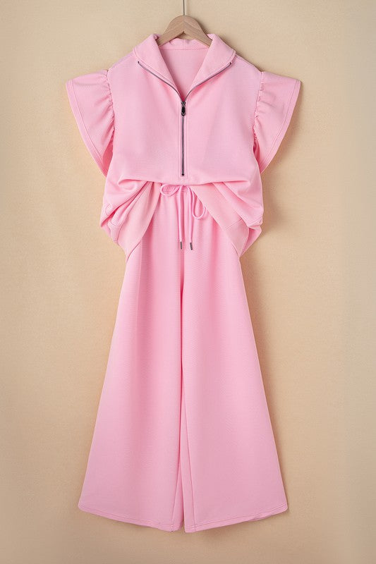 Ruffled Sleeve Zipped Top and Wide Leg Pants Set