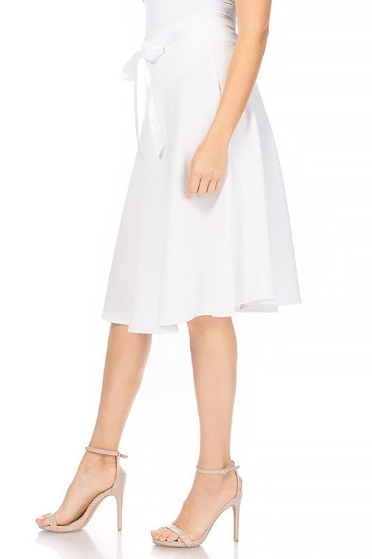 Solid, A-line, knee length skirt with a waist bow tie accent.