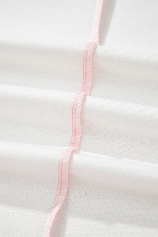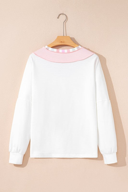 Inject instant personality into your everyday rotation with this eye-catching white top featuring vibrant rainbow stripes and bold color-blocking that celebrates your fun side. Exposed seams add an edgy, modern twist to the playful patchwork design, while the loose silhouette and V-neckline keep things comfortable and breezy. Long sleeves offer coverage without the bulk, making this versatile piece perfect for layering or wearing solo. Polyester/Cotton/Spandex