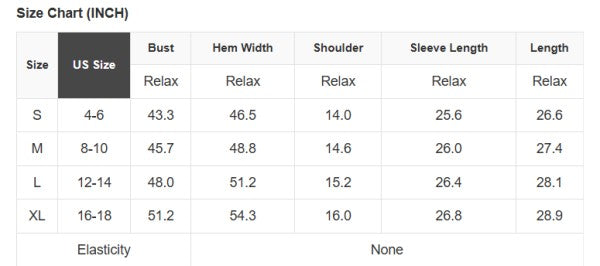 See size chart for approximate measurements.