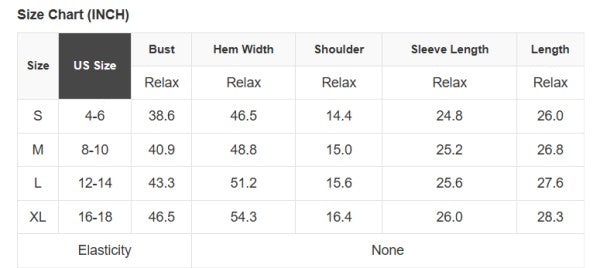 See size chart for approximate measurements.