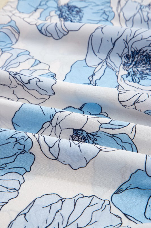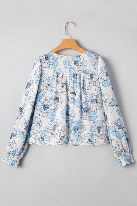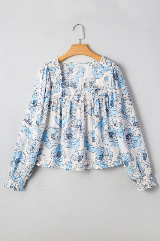 Floral Frilly Smocked Square Neck Long Sleeve Blou