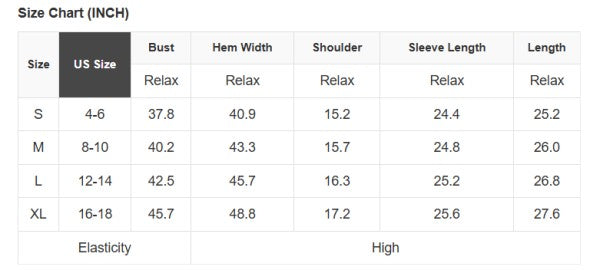See size chart for approximate measurements.