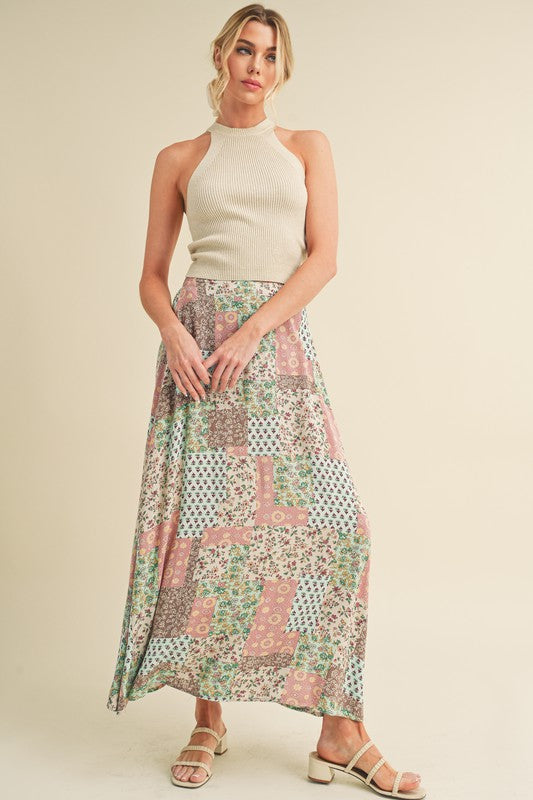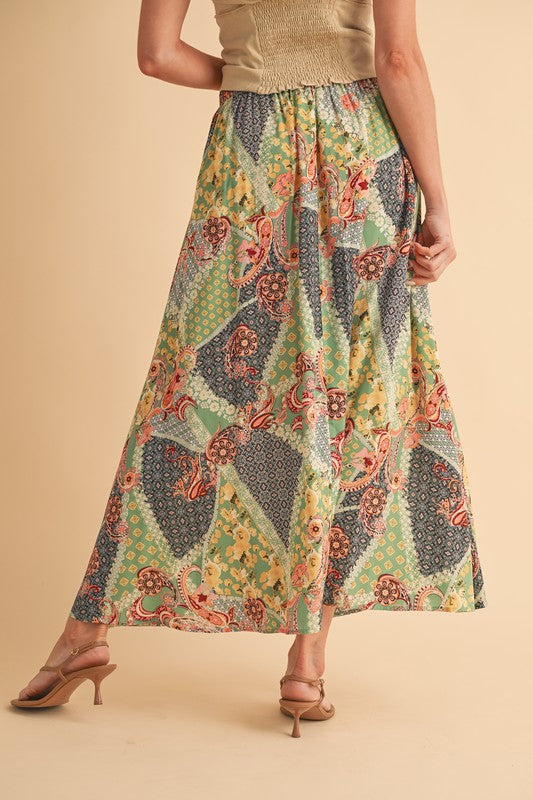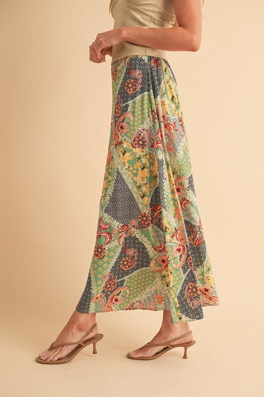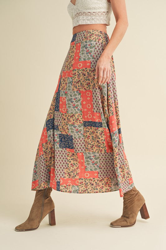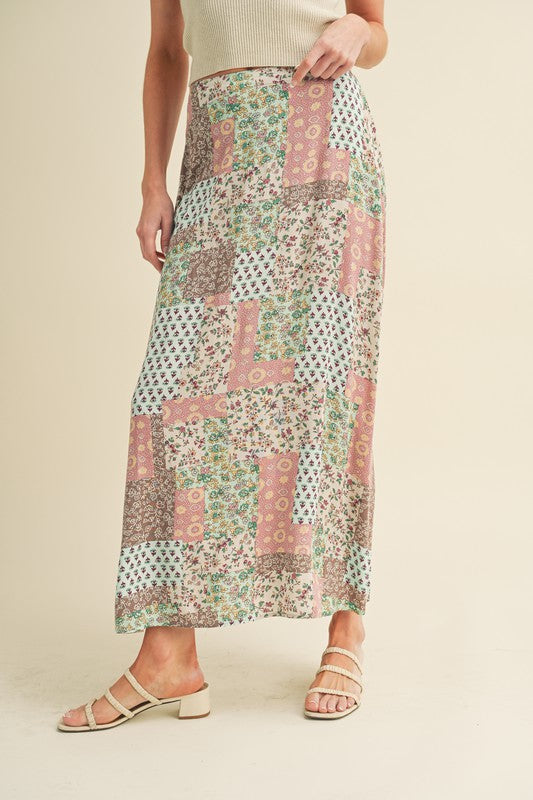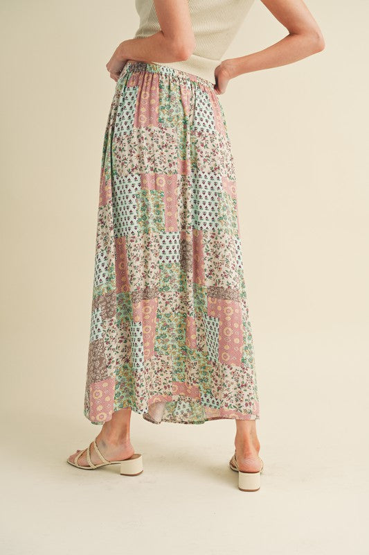Sway with bohemian grace in this flowy maxi skirt. The elasticized back ensures a comfortable fit, while the patchwork print adds a free-spirited touch, making it the perfect choice for festival vibes. Embrace effortless style and movement in this whimsical addition to your wardrobe.