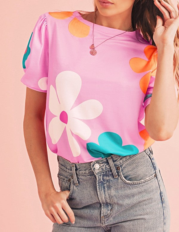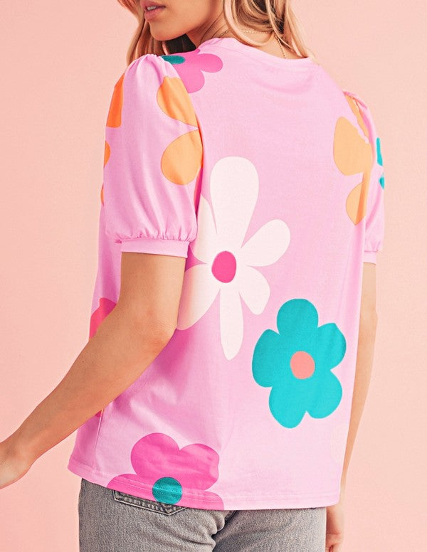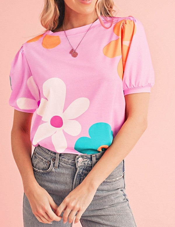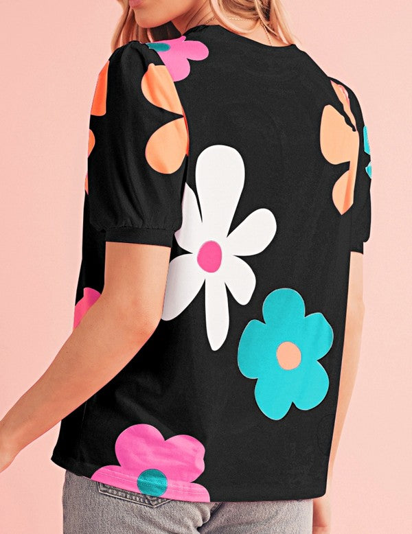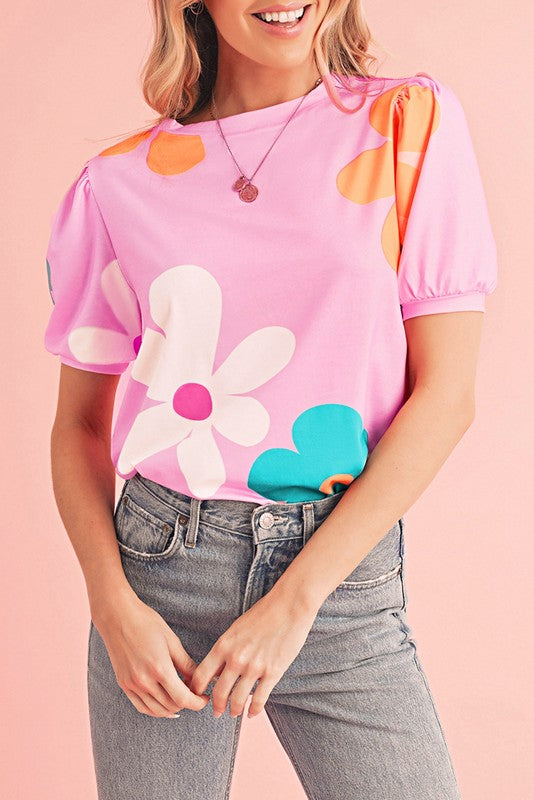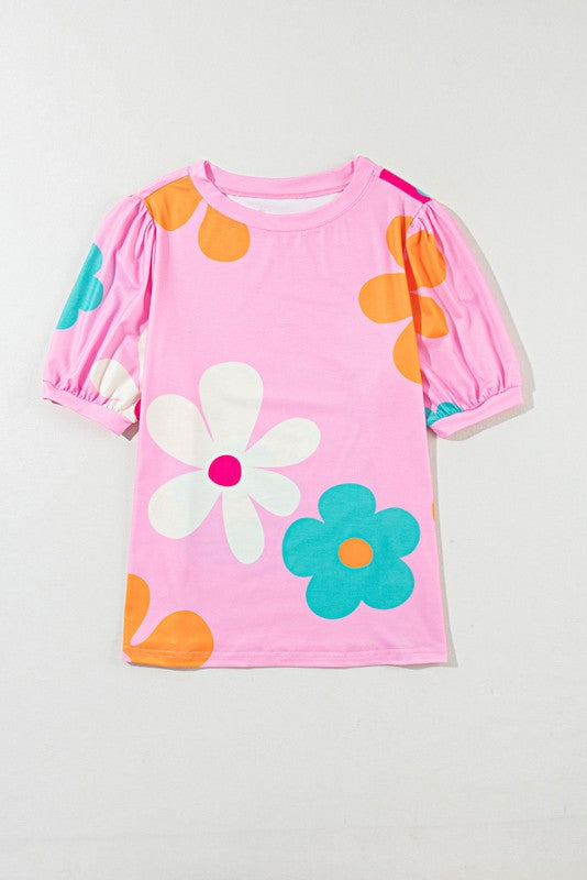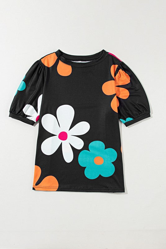 Colorful Flower Print Bubble Sleeve Tee Top