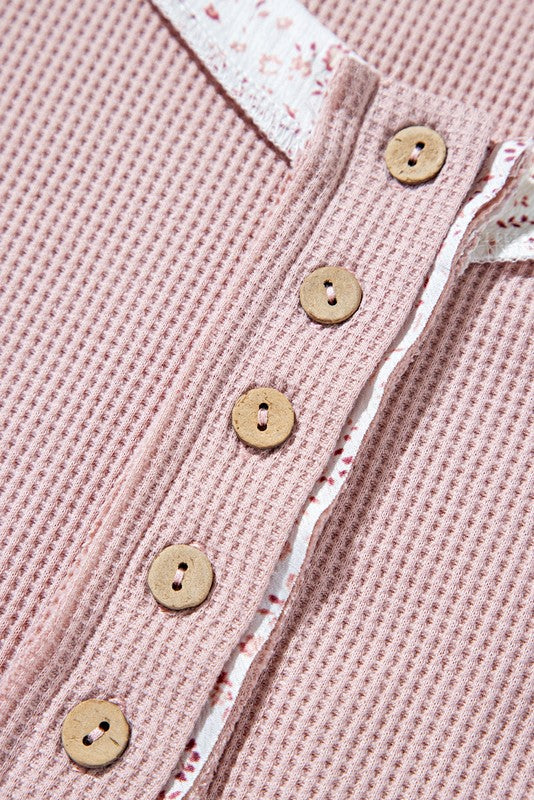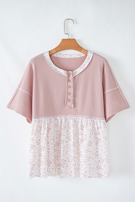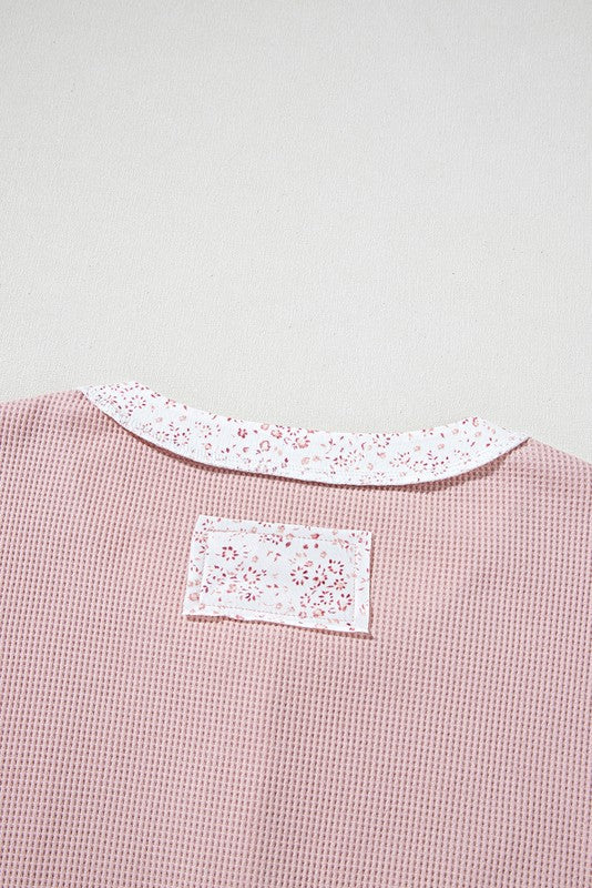 This top features a floral crinkled patchwork with waffle knit fabric.