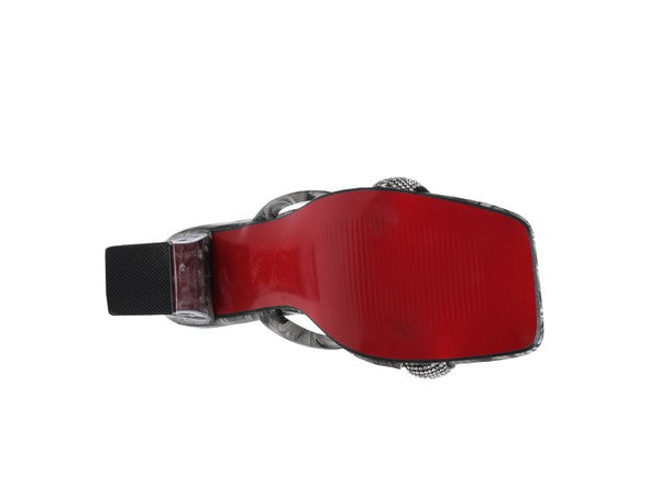 Gorgeous pair of slides in colorful marble prints - has crystal-lined strap detail and a see-through clear block heel.