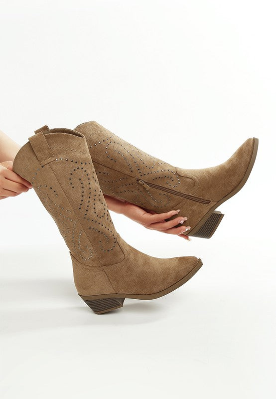 The boots have a straight out of the West chic flair with the classic cowboy construction. The stud embellishments give the boots an extra visual edge while the low block heel and comfortable cushion insoles cut strain.