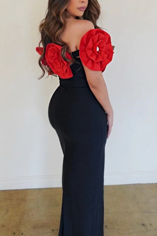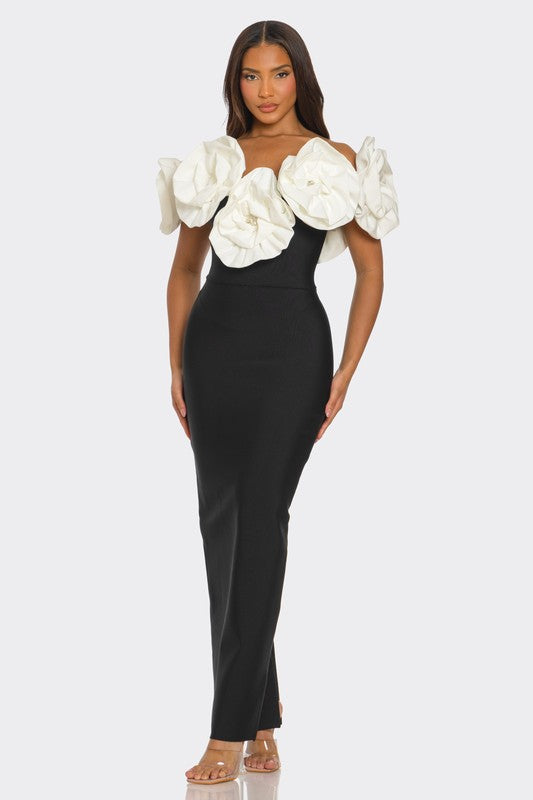 A dramatic black evening gown with oversized white floral appliques cascading across the chest and shoulders. The structured flowers add an artistic, high-fashion touch to the minimalist silhouette, while the sleek, fitted design ensures a refined look. Perfect for making a memorable statement at any black-tie event.