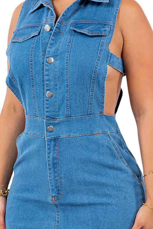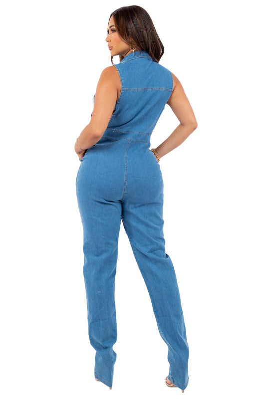 Sexy denim jumpsuit, light weights denim, front button, sleeveless , open side look , side pocket