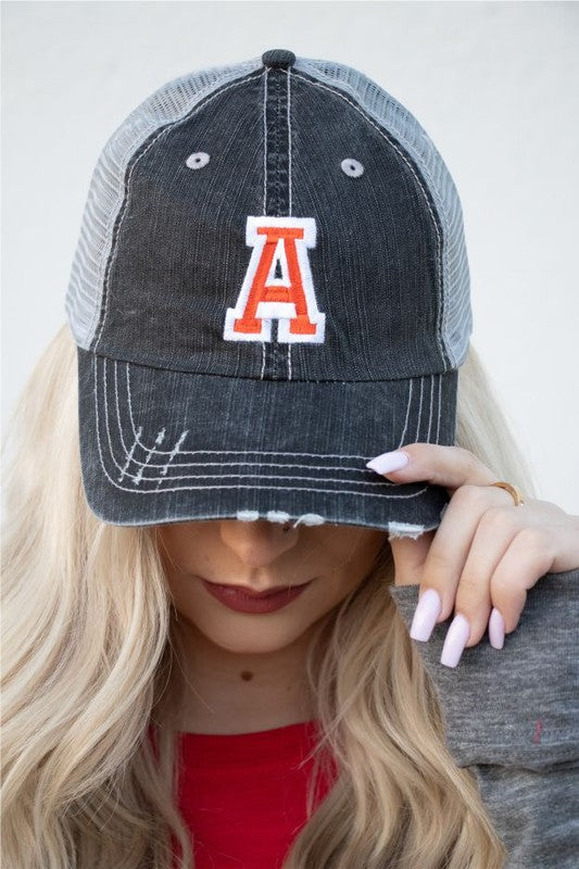 Varsity Block \"A\" Orange/White embroidered on our most popular trucker hat.